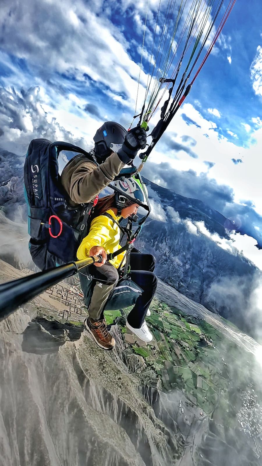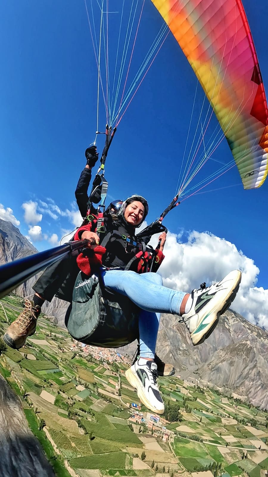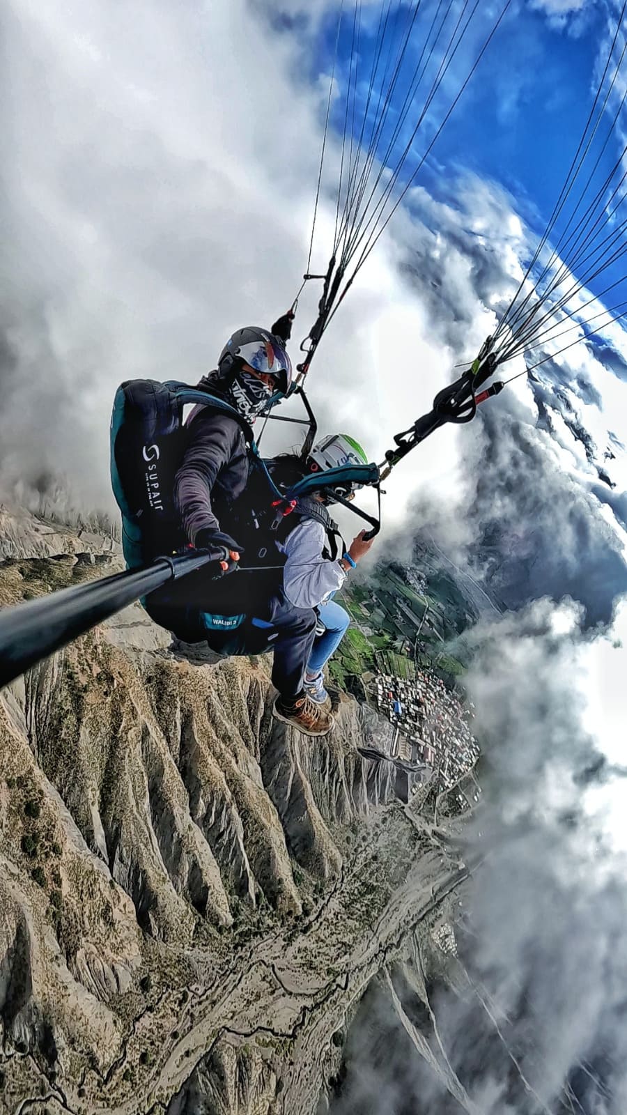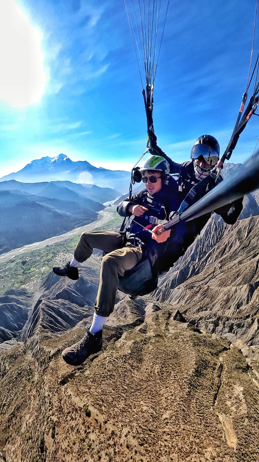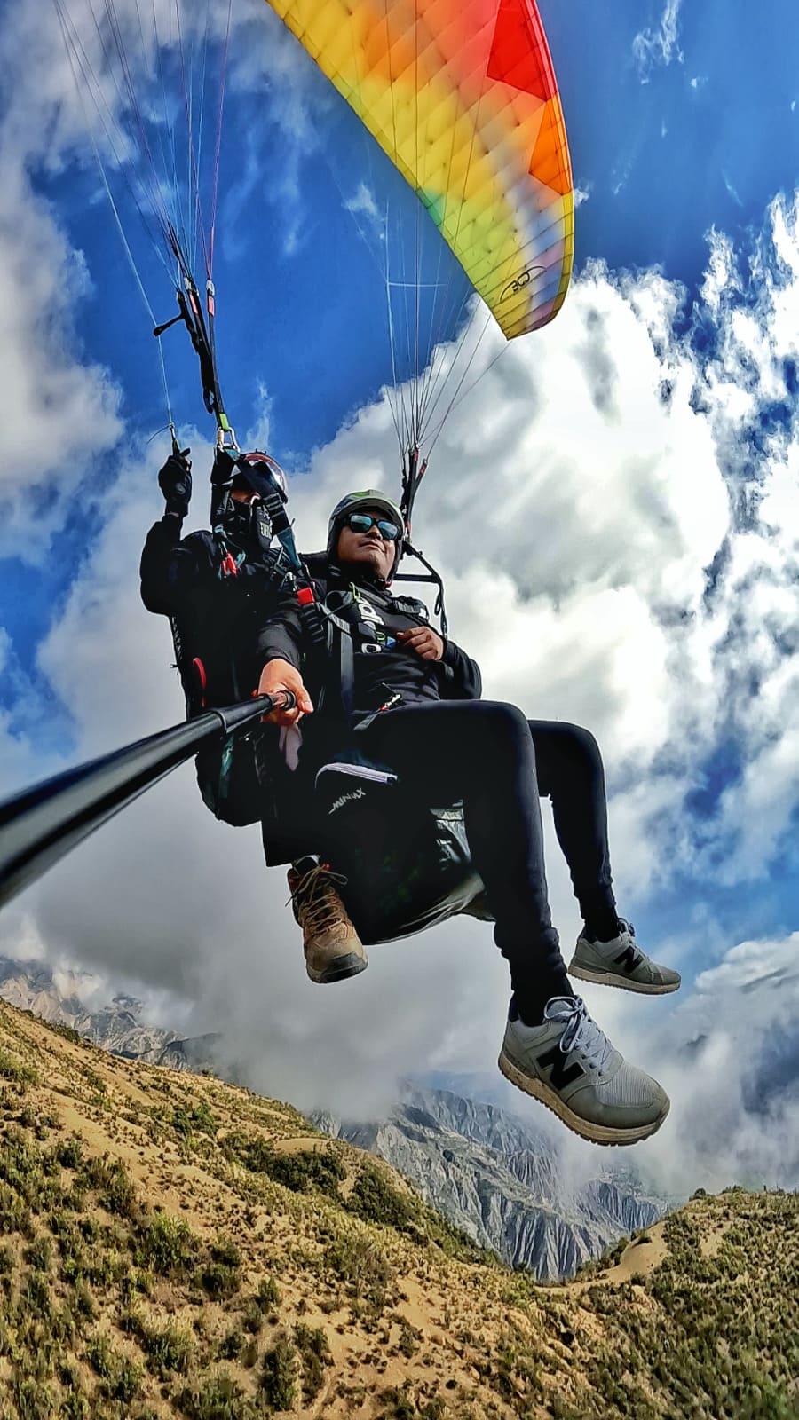 Vive la emoción de un vuelo en parapente biplaza en Yanari, a solo 30 km de La Paz, con nuestro paquete todo incluido: transporte desde tu hotel, equipo certificado y un piloto profesional bilingüe que te guiará de la preparación al despegue. Disfruta de una experiencia de 15 a 20 minutos en el aire, contemplando vistas panorámicas de la ciudad, el valle de La Paz y el majestuoso Illimani, así como las montañas circundantes mientras planeas suavemente sobre hermosos valles andinos. Tras el aterrizaje, te ofrecemos un refrigerio tradicional y fotografías del vuelo para que revivas el momento. Ideal para principiantes y aventureros, nuestro servicio garantiza seguridad, comodidad y una experiencia inolvidable a más de 3 500 m de altura. ¡Reserva hoy y descubre la vida desde el cielo!
